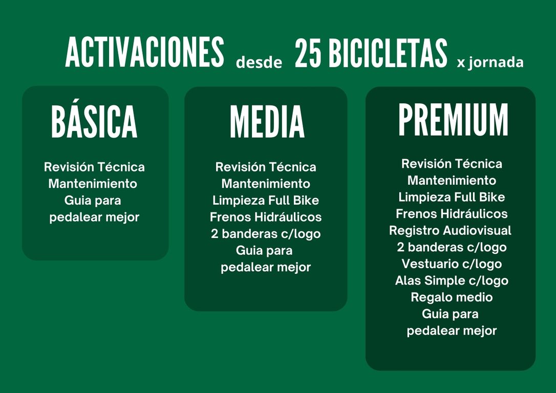 Nuestras activaciones ofrecen desde revisión técnica, mantenimiento express, limpieza, asesoria para ciclistas, hasta opción de regalos, merchandising y contenido para rrss.